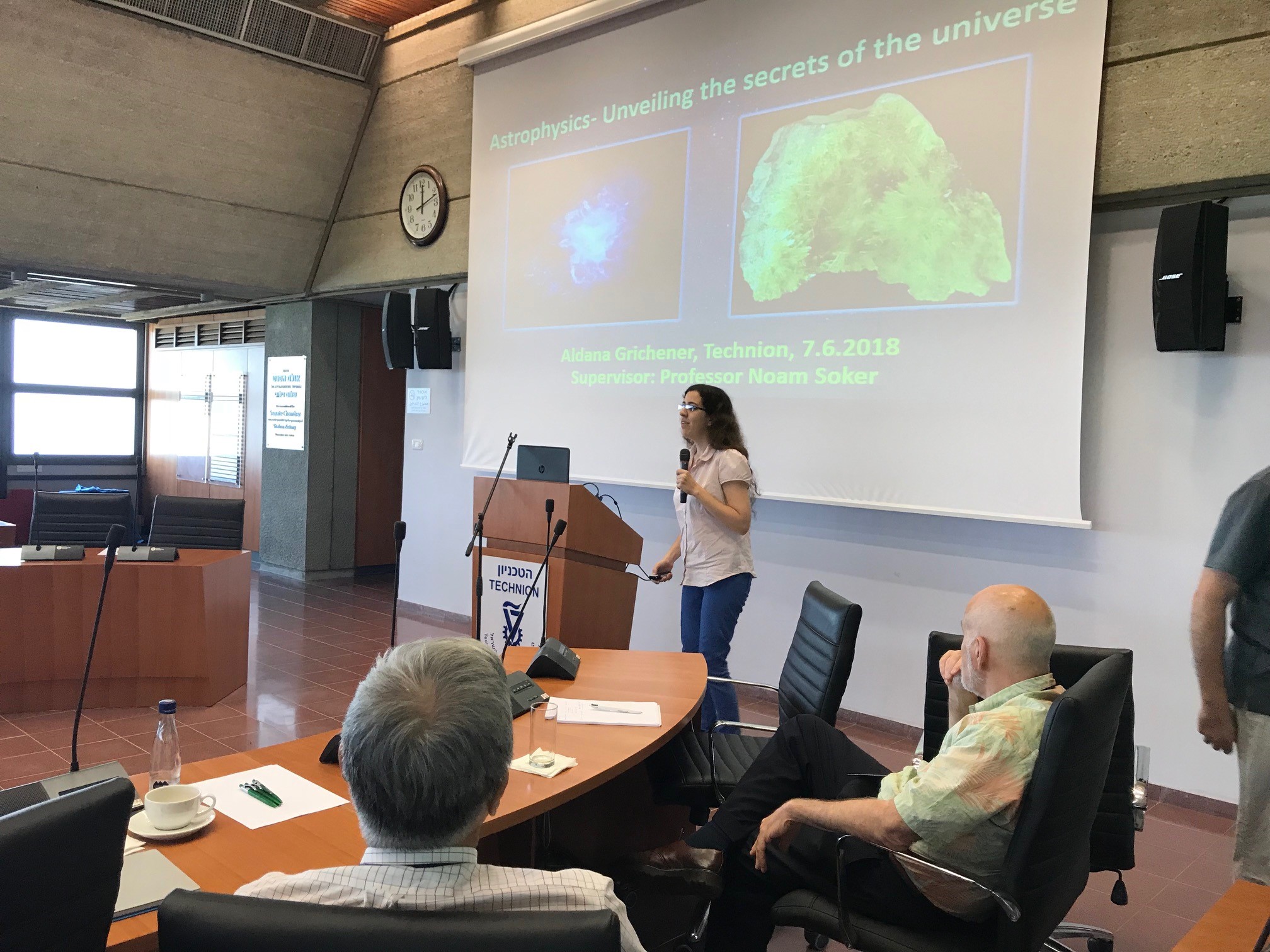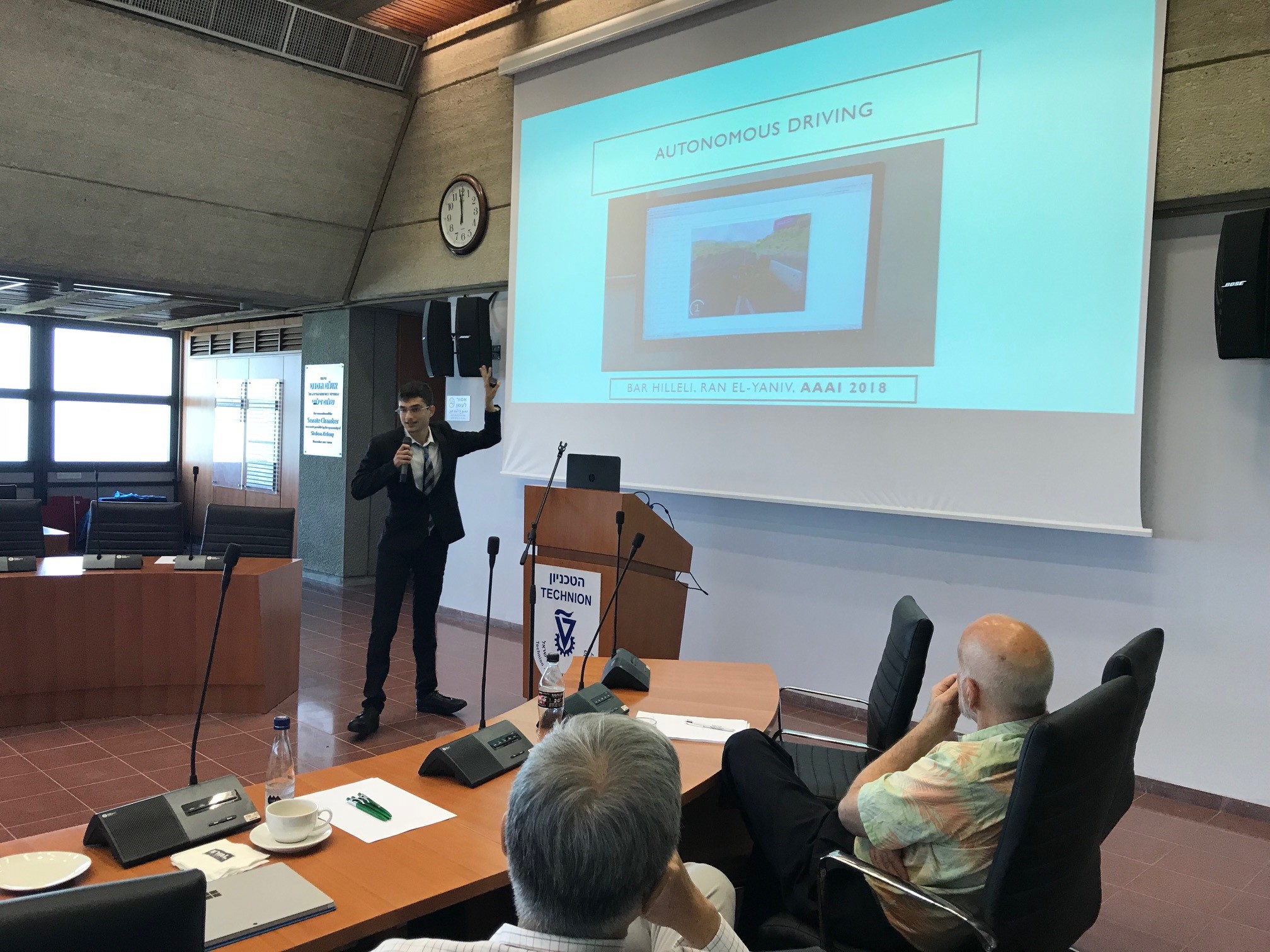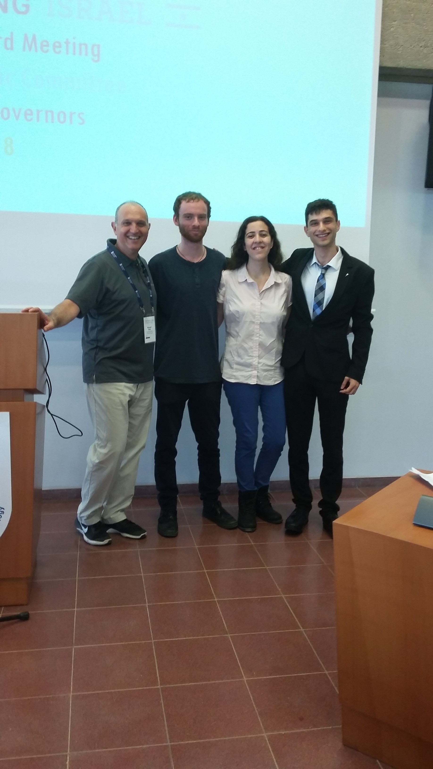 הסטודנטים דין לייטרסדורף, עומר גרנק ואלדנה גריצ'ינר ביחד עם פרופ' מיקי אלעד הציגו מחקרים בוועדה האקדמית של חבר הנאמנים.